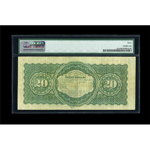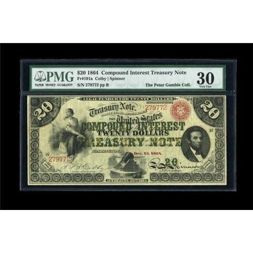 <B>Fr. 191a $20 1864 Compound Interest Treasury Note PMG Very Fine 30.</B></I> This lovely Compound Interest Treasury was from the <I>Malcolm Trask Collection</B></I>, which we sold at the 2005 FUN show. The note was authorized under the act of June 30, 1864 and issued on December 15, 1864, and this solid, problem-free note has not a hint of a defect or restoration. It's far brighter than one would expect for the grade and quite well margined. The bronze overprint has darkened somewhat but has not even begun to crack the paper, as so often happens on this type. Fr. 191a is the most available of the $20 "middle of the book" Interest Bearing and Compound Interest Notes, but most of the notes seen are considerably inferior to this piece, both in technical grade and due to heavy restoration. The eye appeal of this note, combined with its PMG 30 grade, should produce a realization near the $25,000 level.<BR><I>From The Peter Gamble Collection.</B></I><BR><BR><b>Shipping:</b> Coins & Currency (<a target="_blank" href="http://www.heritageauctions.com/common/shipping.php">view shipping information</a>)