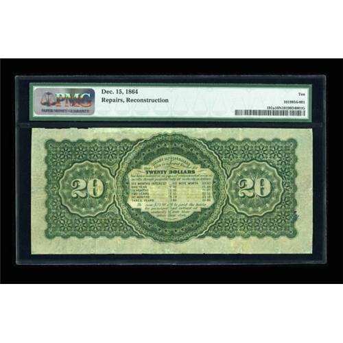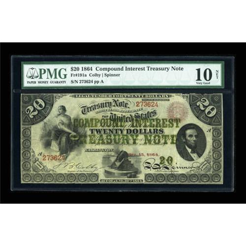 <B>Fr. 191a $20 1864 Compound Interest Treasury Note PMG Very Good 10 Net.</B></I> An appearance sufficient of a VF grade is noted on this issue. The bronzing is solid and does not compromise the paper. "Repairs, Reconstruction" listed on back of holder are actually a centerfold and areas of the top and bottom margin that have been professionally reinforced. <BR><BR><b>Shipping:</b> Coins & Currency (<a target="_blank" href="http://www.heritageauctions.com/common/shipping.php">view shipping information</a>)