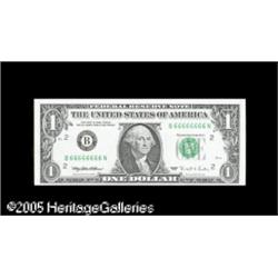 <B>Fr. 1921-B $1 1995 Federal Reserve Note. Choice Crisp Uncirculated.</B></I><BR>Solid serial B66666666N. This crackling fresh note would be a Gem but for minor centering issues. Lot:15853