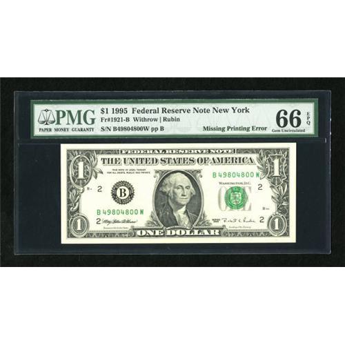 <B>Fr. 1921-B $1 1995 Federal Reserve Note. PMG Gem Uncirculated 66 EPQ.</B></I><BR> A wonderful, widely margined example missing the first printing.<BR><BR><b>Shipping:</b> Coins & Currency (<a target="_blank" href="http://www.heritageauctions.com/common/shipping.php">view shipping information</a>)