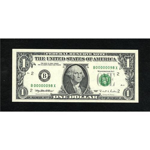 <B>Fr. 1921-B $1 1995 Federal Reserve Note with two digit #98. Superb Gem Crisp Uncirculated.</B></I><BR>Serial number B00000098X is found on this highly desirable modern FRN that will likely find its way into a very high grade holder sooner or later.<BR><BR><b>Shipping:</b> Coins & Currency (<a target="_blank" href="http://www.heritageauctions.com/common/shipping.php">view shipping information</a>)