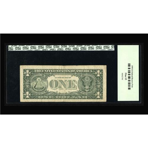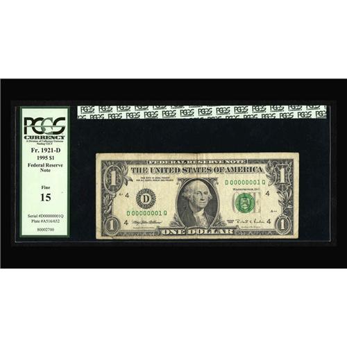 <B>Fr. 1921-D $1 1995 Federal Reserve Note. PCGS Fine 15.</B></I><BR>A circulated example bearing serial number D00000001Q which is perfect for the collector desiring a number 1 note yet not willing to pay the $6000 or so a new example would cost. This piece should go for about half that number.