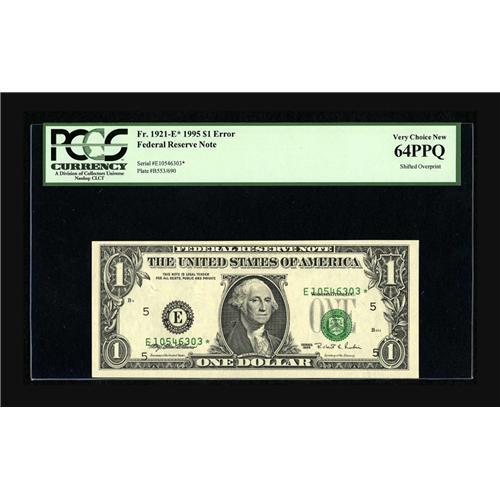 <B>Fr. 1921-E* $1 1995 Federal Reserve Note. PCGS Very Choice New 64PPQ.</B></I><BR>Replacement note errors are scarce no matter how minor.<BR><BR><b>Shipping:</b> Coin/Currency (<a target="_blank" href="http://www.heritageauctions.com/common/shipping.php">view shipping information</a>)