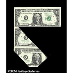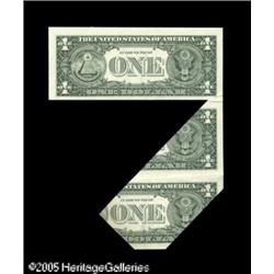<B>Fr. 1921-F $1 1995 Federal Reserve Note. Choice Crisp Uncirculated.</B></I> This Hall of Fame foldover is monstrous and bizarre. Two notes are linked together and then to the "host" note from below. Also, the "host" note shows a light secondary third printing gone awry. Lot:15437