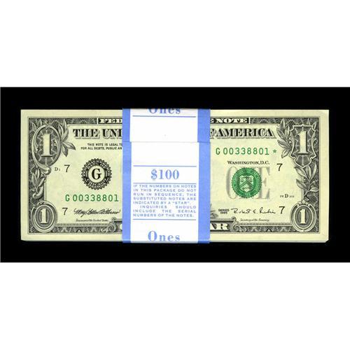 <B>Fr. 1922-G* $1 1995 Federal Reserve Notes. Pack of 100 Notes Gem Crisp Uncirculated.</B></I><BR>Simply a gorgeous pack of notes that had three notes removed and other stars from another run replacing them. Perhaps these were Back Plate 295 errors?<BR><I>From The Bill and Kathy Stella Currency Collection</B></I><BR><BR><b>Shipping:</b> Coin/Currency (<a target="_blank" href="http://www.heritageauctions.com/common/shipping.php">view shipping information</a>)