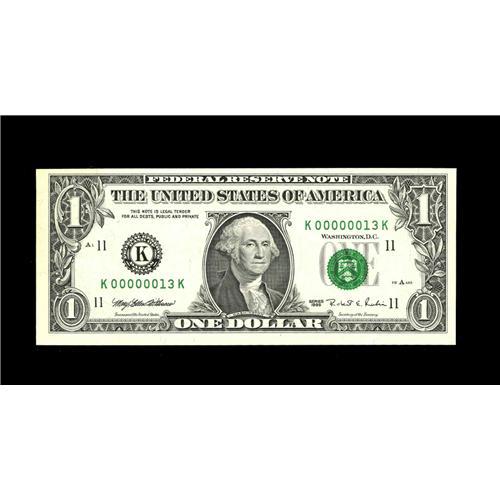 <B>Fr. 1922-K $1 1995 Federal Reserve Note. Choice-Gem CU.</B></I><BR>This note carries the "Lucky 13" serial number.