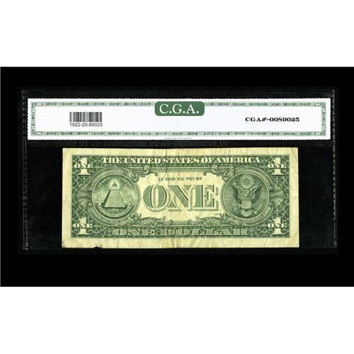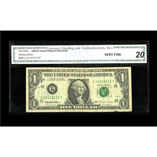 <B>Fr. 1922-L $1 1995 Federal Reserve Note. CGA Very Fine 20.</B></I><BR>A certified solid serial L11111111Y with a tiny nick in the lower margin mentioned for the sake of accuracy.<BR><BR><b>Shipping:</b> Coin/Currency (<a target="_blank" href="http://www.heritageauctions.com/common/shipping.php">view shipping information</a>)