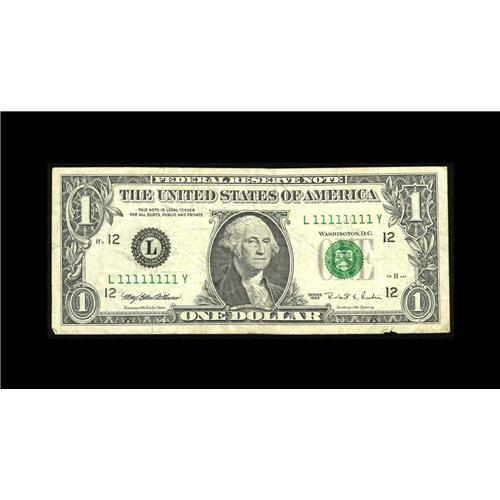 <B>Fr. 1922-L $1 1995 Federal Reserve Note. Fine-Very Fine.</B></I><BR>A circulated example bearing solid serial numbers L11111111Y. There is one miniscule nick in the bottom margin mentioned solely for accuracy in cataloguing that affects nothing.