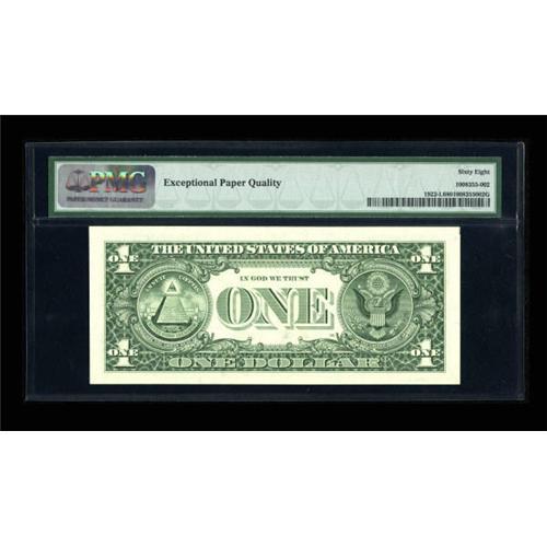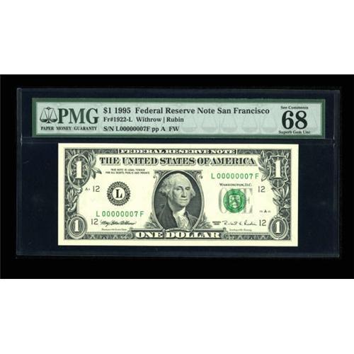 <B>Fr. 1922-L $1 1995 Federal Reserve Note. PMG Superb Gem Uncirculated 68 EPQ.</B></I><BR> A near-perfect Ace that boasts the desirable Serial Number 7.<BR><BR><b>Shipping:</b> Coins & Currency (<a target="_blank" href="http://www.heritageauctions.com/common/shipping.php">view shipping information</a>)