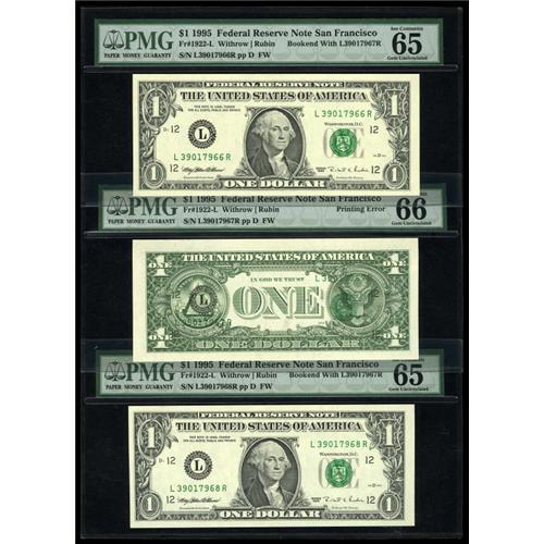 <B>Fr. 1922-L $1 1995 Federal Reserve Notes. PMG Gem Uncirculated 65 EPQ and 66 EPQ.</B></I><BR> This neat serial number on back error comes complete with bookends each grading 65 EPQ.<BR><BR><b>Shipping:</b> Coins & Currency (<a target="_blank" href="http://www.heritageauctions.com/common/shipping.php">view shipping information</a>)
