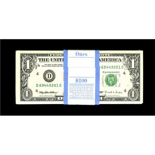 <B>Fr. 1923-D $1 1995 Web Federal Reserve Notes. Original Pack of 100. Gem Crisp Uncirculated.</B></I><BR>This D-C block pack has been well cared for. Each note has plate combination 2/9 and is from run 11. These notes carry a catalogue value of $15 each in the Kvederas book.<BR><BR><b>Shipping:</b> Coin/Currency (<a target="_blank" href="http://www.heritageauctions.com/common/shipping.php">view shipping information</a>)