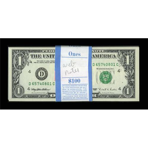 <B>Fr. 1923-D $1 1995 Web Federal Reserve Notes. Original Pack of 100. Very Choice Crisp Uncirculated</B></I>.<B></B></I><BR> Here is another original pack of webs from the D-C block, Run 11, 2/9 Combo.<BR><BR><b>Shipping:</b> Coins & Currency (<a target="_blank" href="http://www.heritageauctions.com/common/shipping.php">view shipping information</a>)