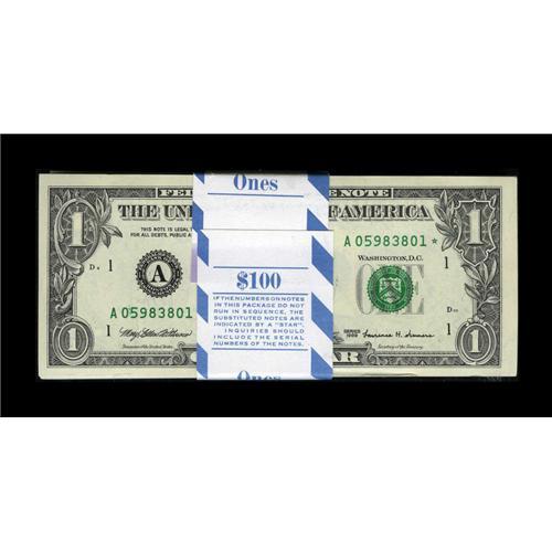 <B>Fr. 1924-A* $1 1999 Federal Reserve Notes. Original Pack of 100. Gem Crisp Uncirculated.</B></I><BR>This is the first time for us to a have a pack on this Friedberg number. The top note shows handling.<BR><I>From The Rolling Plains Collection</B></I><BR><BR><b>Shipping:</b> Coins & Currency (<a target="_blank" href="http://www.heritageauctions.com/common/shipping.php">view shipping information</a>)