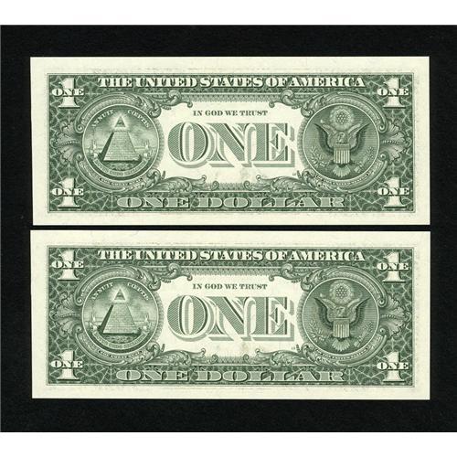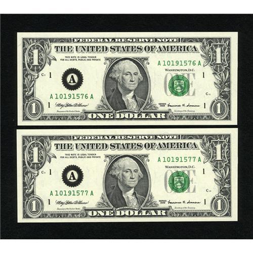 <B>Fr. 1924-A $1 1999 Federal Reserve Notes. Two Consecutive Examples. Gem Crisp Uncirculated.</B></I><BR>The district seal is greatly over inked on this pair.<BR><BR><BR><b>Shipping:</b> Coins & Currency (<a target="_blank" href="http://www.heritageauctions.com/common/shipping.php">view shipping information</a>)