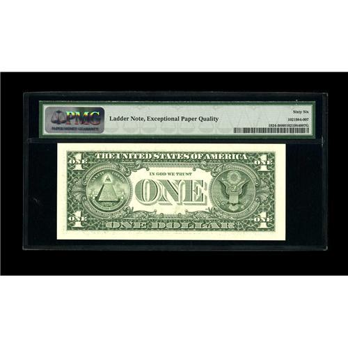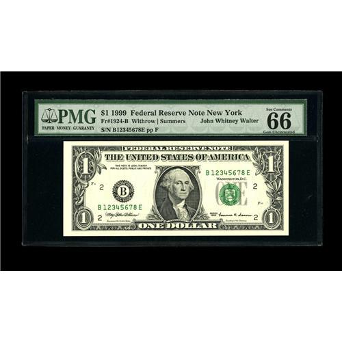 <B>Fr. 1924-B $1 1999 Federal Reserve Note. PMG Gem Uncirculated 66EPQ.</B></I><BR>An exceptional up ladder with serial number B12345678E that comes from the John Whitney Walter collection.<BR><BR><b>Shipping:</b> Coin/Currency (<a target="_blank" href="http://www.heritageauctions.com/common/shipping.php">view shipping information</a>)