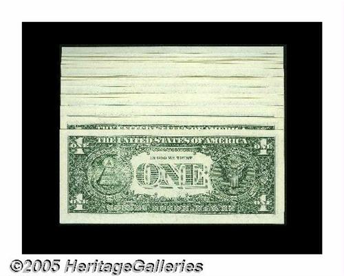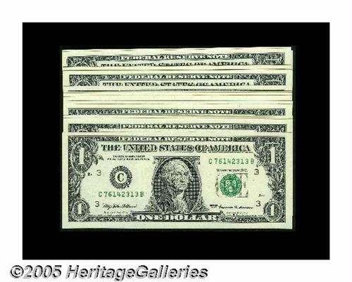 <B>Fr. 1924-C $1 1999 Federal Reserve Notes. Twenty-five Consecutive Examples. Gem Crisp Uncirculated.</B></I> A progressively worse ink jet failure occurs on this run of Philly $1s that starts out with a light stripe and finishes up with a weakly printed one-half of the back of the top note. Sheets of notes are printed in descending order.<BR>