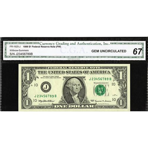 <B>Fr. 1925-J $1 1999 Federal Reserve Note. CGA Gem Uncirculated 67.</B></I><BR>A neat ladder serial number from two through nine on district ten.