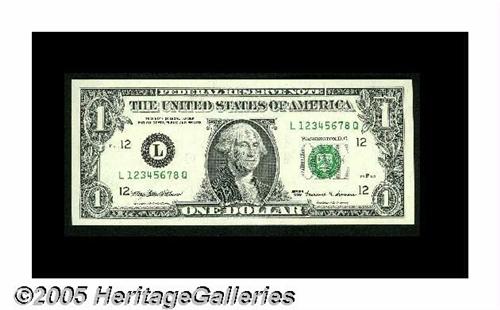 <B>Fr. 1925-L $1 1999 Federal Reserve Note. Gem Crisp Uncirculated.</B></I><BR>A gorgeous example bearing up-ladder serial number L12345678Q, easily fit for the collector of fancy numbers who desires only the finest.