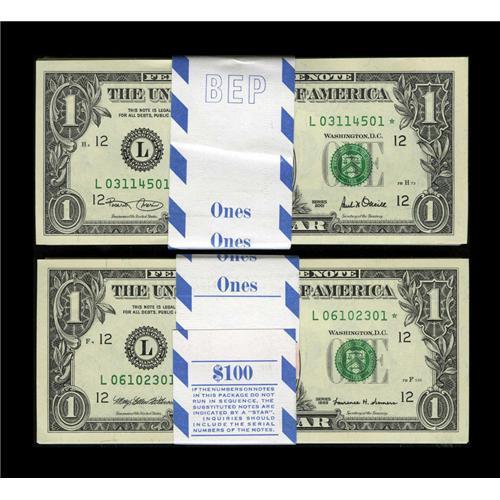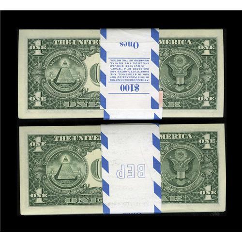 <B>Fr. 1925-L* $1 1999 Federal Reserve Notes. Original Pack of 100. Gem CU</B></I><BR><B>Fr. 1927-L* $1 2001 Federal Reserve Notes. Original Pack of 100. Gem CU.</B></I><BR>Both of these packs have been pampered.<BR><I>From The Rolling Plains Collection</B></I><BR><BR><b>Shipping:</b> Coins & Currency (<a target="_blank" href="http://www.heritageauctions.com/common/shipping.php">view shipping information</a>)