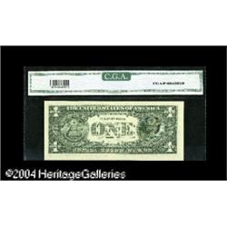 Fr. 1926-B $1 2001 Federal Reserve Note. CGA Gem Unci <B>Fr. 1926-B $1 2001 Federal Reserve Note. CGA Gem Uncirculated 66.</B></I> A neat two interior digit mismatch on a Series 2001 note which we've not seen or heard of previously. It's been encapsulated by CGA, and appears to be a hugely margined beauty that well deserves its 66 grade. With the popularity of mismatched serial number notes at an all time high, expect this exciting new discovery double digit mismatch to realize... <BR><BR><B>Important notice:</B> Heritage usually auctions material at the rate of 200-250 lots per hour. On some occasions eBay Live bid software or the Internet may not be able to keep up with the pace of the auction. We recommend placing a realistic absentee bid now as insurance to avoid disappointment. Occasionally the auctioneer may eliminate or reject an eBay Live bid, and the auctioneer may also reopen a lot after the close of the eBay live bidding (usually because we missed an audience bid), and may reject your bid even if it shows you as the winning bidder. By bidding via eBay Live, you agree that Heritage may award the lot to another bidder at its sole discretion under the circumstances described above or any other reasonable circumstances. Since eBay bids are not shown to us until we open the lot on the floor, we treat those bids just like floor bids. In most cases the floor responds before the eBay bid is presented to us, due to Internet lag time, so for consistency we have made it a policy that floor bids are always considered first over tie eBay live bids. Also please note that all Heritage lots purchased through eBay Live carry a 20% Buyer's Premium. Please make sure you read the Terms and Conditions before you bid. This lot is being auctioned in conjunction with a live floor auction by Heritage Galleries & Auctioneers. All final auction and invoice information will be supplied by Heritage Galleries & Auctioneers, and all other information should be considered preliminary. Lot:16094