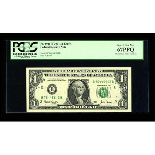 <B>Fr. 1926-B $1 2001 Federal Reserve Note. PCGS Superb Gem New 67PPQ.</B></I><BR> This two digit mismatch boasts gigantic margins and is the most recent error of this type to surface.<BR><BR><b>Shipping:</b> Coins & Currency (<a target="_blank" href="http://www.heritageauctions.com/common/shipping.php">view shipping information</a>)