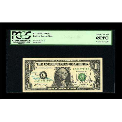 <B>Fr. 1926-C $1 2001 Federal Reserve Note. PCGS Superb Gem New 69PPQ.</B></I><BR> Broad margins and a duel autograph are highlighted by a near-perfect grade.<BR><BR><b>Shipping:</b> Coins & Currency (<a target="_blank" href="http://www.heritageauctions.com/common/shipping.php">view shipping information</a>)