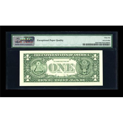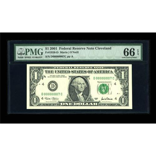 <B>Fr. 1926-D $1 2001 Federal Reserve Note. PMG Gem Uncirculated 66 EPQ.</B></I><BR> A well margined Serial Number 7 specimen. This is the lowest serial number example of this issue that we've handled.<BR><BR><b>Shipping:</b> Coins & Currency (<a target="_blank" href="http://www.heritageauctions.com/common/shipping.php">view shipping information</a>)