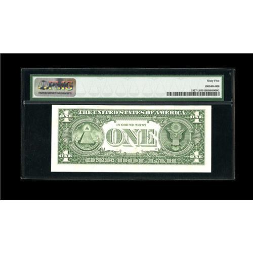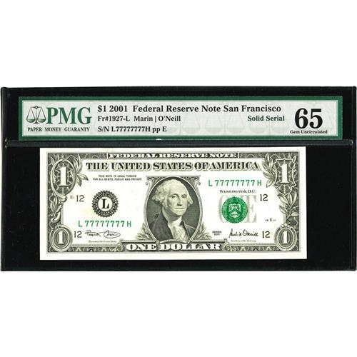 <B>Fr. 1927-L $1 2001 Federal Reserve Note. PMG Gem Uncirculated 65.</B></I><BR>Solid serial number 77777777 graces this wide margined beauty.