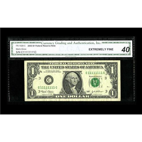 <B>Fr. 1928-C $1 2003 Federal Reserve Note. CGA Extremely Fine 40.</B></I><BR>This certified Philadelphia note displays serial C11111111C.<BR><BR><b>Shipping:</b> Coin/Currency (<a target="_blank" href="http://www.heritageauctions.com/common/shipping.php">view shipping information</a>)