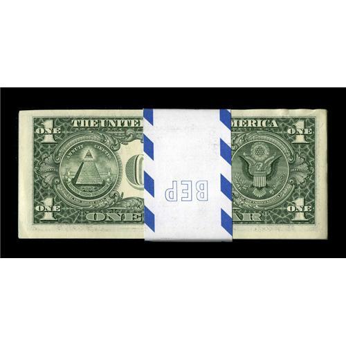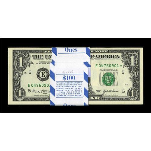 <B>Fr. 1928-E* $1 2003 Federal Reserve Star Notes. Original Pack of 100 Choice Crisp Uncirculated.</B></I><BR>These notes are from a run not listed in the new edition of the Schwartz-Lindquist Small Size Guide. The last five pieces have a bump into the design in the upper left margin.<BR><BR><b>Shipping:</b> Coins & Currency (<a target="_blank" href="http://www.heritageauctions.com/common/shipping.php">view shipping information</a>)