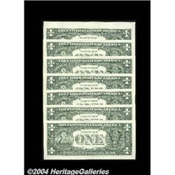 Fr. 1929-F $1 2003 Federal Reserve Notes. Gem Crisp Uncirculated. A set of seven consecutive notes with the middle note displaying an inverted third printing and associated cutting error. All six bookends are absolutely normal. This is a neat set which would make an excellent display item. <BR><BR><B>Important notice:</B> Heritage usually auctions material at the rate of 200-250 lots per hour. On some occasions eBay Live bid software or the Internet may not be able to keep up with the pace of the auction. We recommend placing a realistic absentee bid now as insurance to avoid disappointment. Occasionally the auctioneer may eliminate or reject an eBay Live bid, and the auctioneer may also reopen a lot after the close of the eBay live bidding (usually because we missed an audience bid), and may reject your bid even if it shows you as the winning bidder. By bidding via eBay Live, you agree that Heritage may award the lot to another bidder at its sole discretion under the circumstances described above or any other reasonable circumstances. Since eBay bids are not shown to us until we open the lot on the floor, we treat those bids just like floor bids. In most cases the floor responds before the eBay bid is presented to us, due to Internet lag time, so for consistency we have made it a policy that floor bids are always considered first over tie eBay live bids. Also please note that all Heritage lots purchased through eBay Live carry a 20% Buyer's Premium. Please make sure you read the Terms and Conditions before you bid. <BR><BR><B>IMPORTANT ANNOUNCEMENT ABOUT RESERVES:</B> Heritage now divulges all reserves on its web site 7 days before every auction. If you want to know whether the reserve on this lot has been met, and if not, what the reserve amount is, please visit this lot page on the HeritageCoin.com web site, or email: bid@HeritageGalleries.com