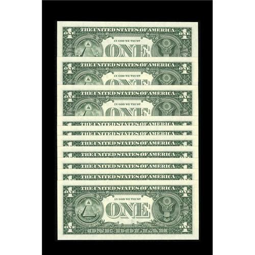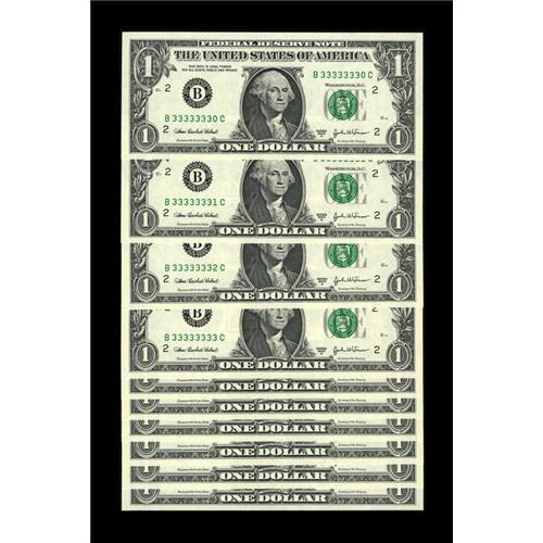 <B>Fr. 1930-B $1 2003A Federal Reserve Notes. Ten Consecutive Examples. Solid Three Serial Number. Gem Crisp Uncirculated.</B></I><BR> The solid three serial number note in this pleasing run lays claim to being Superb. All of the other notes carry seven consecutive threes in the serial number.<BR><BR><b>Shipping:</b> Coins & Currency (<a target="_blank" href="http://www.heritageauctions.com/common/shipping.php">view shipping information</a>)