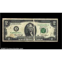 Fr. 1935-A $2 1976 Federal Reserve Note. Very Fine. A scarce error on a note of this denomination, as a top to bottom gutter fold bisects the portrait oval. Important notice: We expect to be auctioning lots at the rate of 200-250 per hour. Sometimes eBay Premier live bid software cannot keep up with that pace, so we strongly recommend that you place a realistic proxy bid now as insurance to avoid disappointment. Also please note that all Heritage/CAA lots purchased through eBay Premier carry a 20% Buyer's Premium. Please make sure you read the Terms and Conditions.