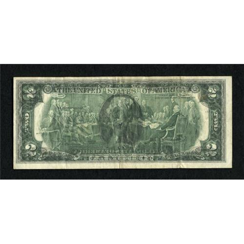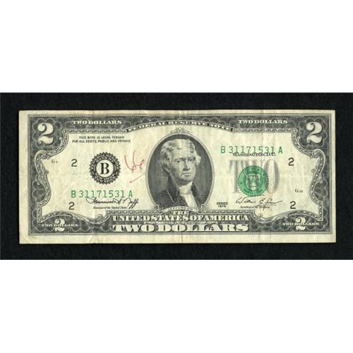 <B>Fr. 1935-B $2 1976 Federal Reserve Note. Fine-Very Fine.</B></I> This New York $2 has a 100% dark face to back offset that is sure to please. Teller graffiti "66" in red ink is also found on the face.<BR><BR><b>Shipping:</b> Coins & Currency (<a target="_blank" href="http://www.heritageauctions.com/common/shipping.php">view shipping information</a>)