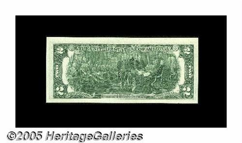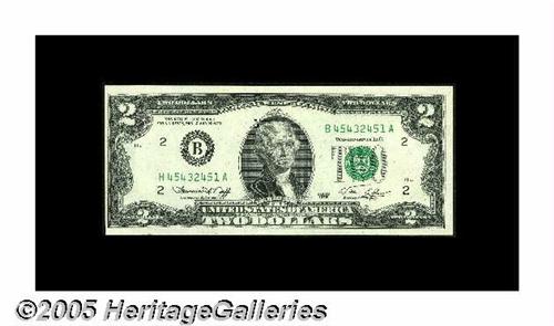 <B>Fr. 1935-B $2 1976 Federal Reserve Note. Very Choice Crisp Uncirculated.</B></I> A second example of the H/B mismatched prefix $2 note, crackling fresh but just a little tighter on the left margin than the consecutive example above.