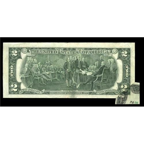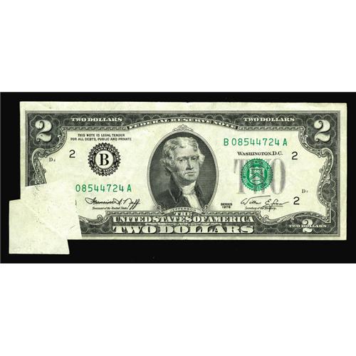<B>Fr. 1935-B $2 1976 Federal Reserve Note. Very Fine.</B></I><BR>This interesting foldover has affected all three printings on this deuce. As such it is quite desirable and scarce. The paper is quite crisp and bright with excellent embossing present. A wonderful error that is sure to please.