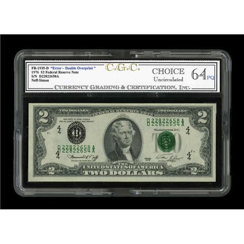 <B>Fr. 1935-D $2 1976 Federal Reserve Note. CGC Choice Uncirculated 64.</B></I> A lovely example of this very rare double printing, which has auction records approaching the five figure level. This example is bright and certainly well centered enough to carry the full Gem grade, which it likely would have received at any other grading service than CGC.