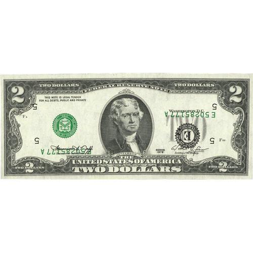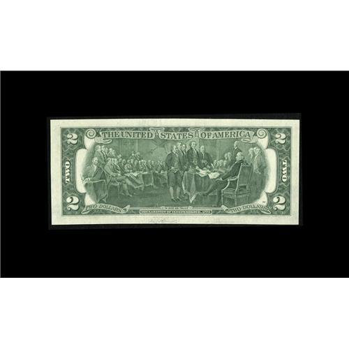 <B>Fr. 1935-E $2 1976 Federal Reserve Note. Crisp Uncirculated.</B></I><BR>Inverted third printing errors on $2 notes affected over half of the districts. Fortunately this example has survived fold free with bold color.
