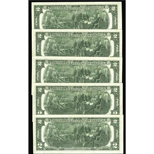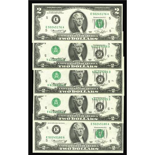 <B>Fr. 1935-E $2 1976 Federal Reserve Notes. Gem Crisp Uncirculated.</B></I> Last appearing in our 2005 Long Beach sale, "A wonderful run of five consecutive notes, the two bookends perfectly normal and the three notes in the middle each having an inverted third printing. The $2 denomination is the key to any set of inverted third printings, and this five note run would make a great display item." Tonight look for this set to hammer in the range of...