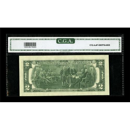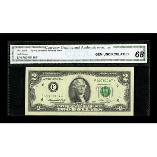 <B>Fr. 1935-F* $2 1976 Federal Reserve Note. CGA Gem Uncirculated 68.</B></I><BR> This sheet cut replacement boasts gigantic margins.<BR><BR><b>Shipping:</b> Coins & Currency (<a target="_blank" href="http://www.heritageauctions.com/common/shipping.php">view shipping information</a>)