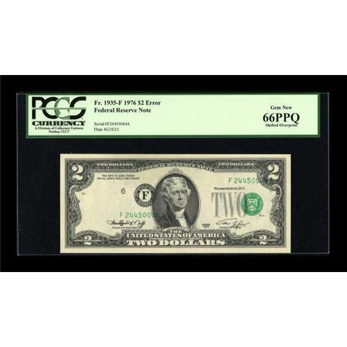 <B>Fr. 1935-F $2 1976 Federal Reserve Note. PCGS Gem New 66PPQ.</B></I><BR> The third printing has infiltrated the portrait area on this pleasing, well margined note. This is a highly sought after denomination for errors.<BR><BR><b>Shipping:</b> Coins & Currency (<a target="_blank" href="http://www.heritageauctions.com/common/shipping.php">view shipping information</a>)