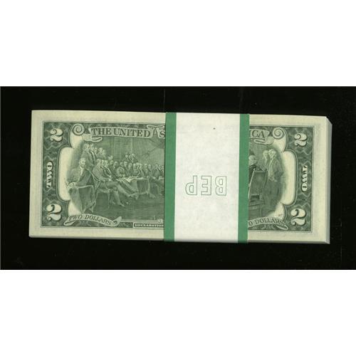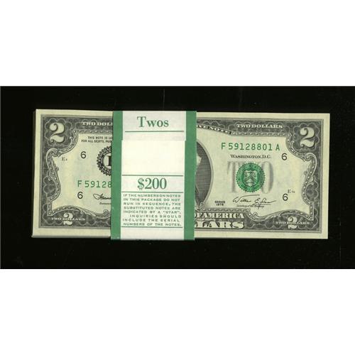 <B>Fr. 1935-F $2 1976 Federal Reserve Notes. Original Pack of 100 Gem Crisp Uncirculated.</B></I><BR>This bank fresh pack was put away long ago.<BR><BR><b>Shipping:</b> Coins & Currency (<a target="_blank" href="http://www.heritageauctions.com/common/shipping.php">view shipping information</a>)