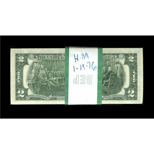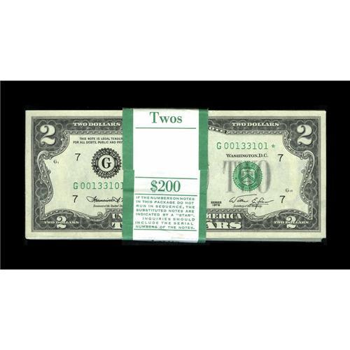 <B>Fr. 1935-G* $2 1976 Federal Reserve Notes. Original Pack of 100. Gem Crisp Uncirculated.</B></I><BR>This is the first time that we have handled a full pack of Chicago stars for the Bicentennial series. Chicago is one of the scarcer districts for stars as the Schwartz-Lindquist reference lists the notes at $60 a piece in CU. Ample margins and nice centering are found on the notes of this pack. The BEP band has been hand-dated with blue pencil.<BR><BR><b>Shipping:</b> Coins & Currency (<a target="_blank" href="http://www.heritageauctions.com/common/shipping.php">view shipping information</a>)