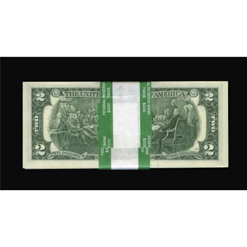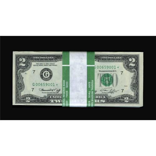 <B>Fr. 1935-G* $2 1976 Federal Reserve Notes. Pack of 100. Choice Crisp Uncirculated.</B></I><BR> This pack is held by a Federal Reserve Bank band. The final four notes are regular Chicago Bicentennial Deuces.<BR><I>From The Drew Keough Collection</B></I><BR><BR><b>Shipping:</b> Coins & Currency (<a target="_blank" href="http://www.heritageauctions.com/common/shipping.php">view shipping information</a>)
