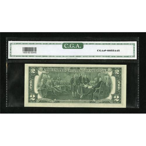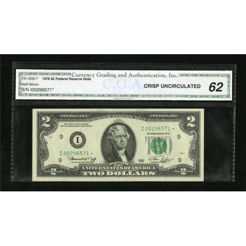 <B>Fr. 1935-I* $2 1976 Federal Reserve Star Note. CGA Crisp Uncirculated 62.</B></I><BR> A nice example of this tougher Minneapolis issue.<BR><BR><b>Shipping:</b> Coins & Currency (<a target="_blank" href="http://www.heritageauctions.com/common/shipping.php">view shipping information</a>)