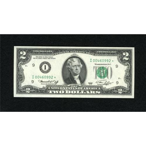 <B>Fr. 1935-I* $2 1976 Federal Reserve Note. Choice Crisp Uncirculated.</B></I><BR> A bright Minneapolis example which is the key to the replacements for this series.<BR><BR><b>Shipping:</b> Coins & Currency (<a target="_blank" href="http://www.heritageauctions.com/common/shipping.php">view shipping information</a>)