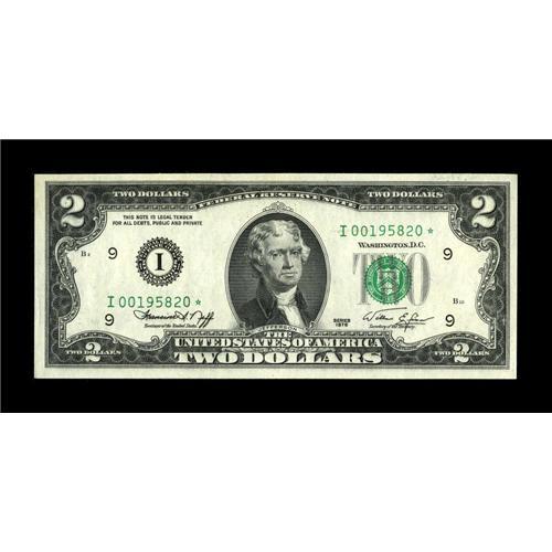 <B>Fr. 1935-I* $2 1976 Federal Reserve Note. Gem Crisp Uncirculated.</B></I><BR>The paper quality is blazingly original and the embossing bold on this scarce star.<BR><BR><b>Shipping:</b> Coins & Currency (<a target="_blank" href="http://www.heritageauctions.com/common/shipping.php">view shipping information</a>)