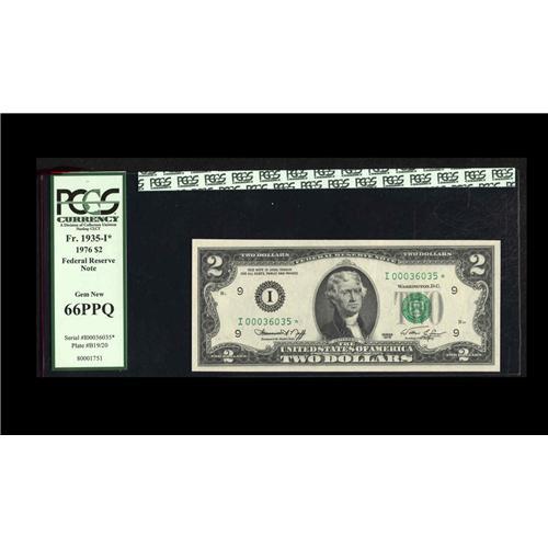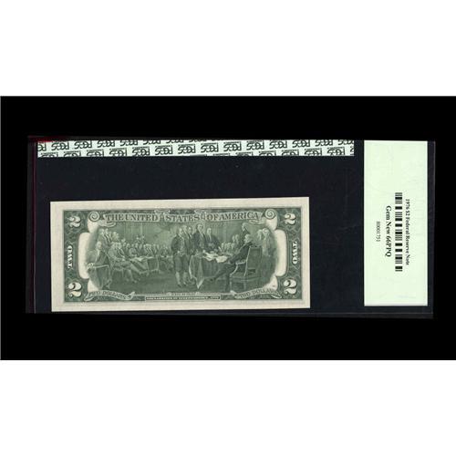 <B>Fr. 1935-I* $2 1976 Federal Reserve Note. PCGS Gem New 66 PPQ.</B></I><BR>One of a pair of PCGS graded Gem 66 PPQ Minneapolis star examples offered here. This is the key to the series, and will likely realize...