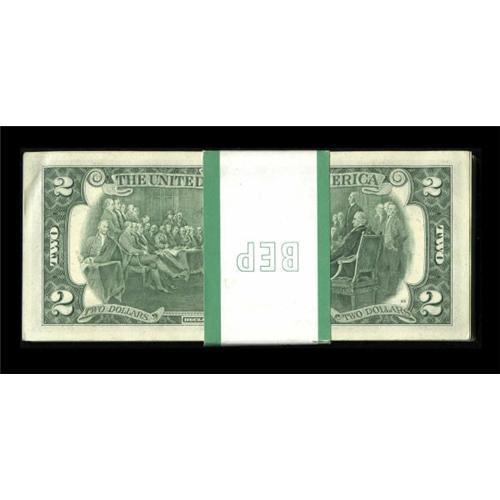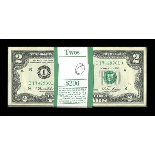 <B>Fr. 1935-I $2 1976 Federal Reserve Notes. Original Pack of 100. Very Choice Crisp Uncirculated.</B></I><BR> This Minneapolis pack is original with fully Very Choice notes in the pack, save for a couple of notes at the front and back of the pack.<BR><BR><b>Shipping:</b> Coins & Currency (<a target="_blank" href="http://www.heritageauctions.com/common/shipping.php">view shipping information</a>)