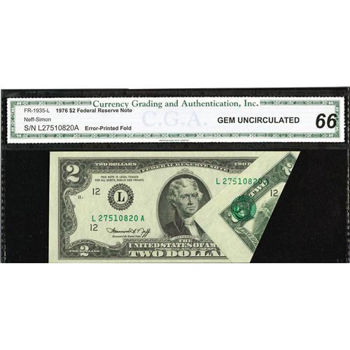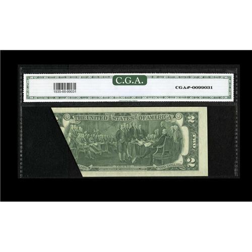 <B>Fr. 1935-L $2 1976 Federal Reserve Note. CGA Gem Uncirculated 66.</B></I><BR>This eye catching error is very elusive on the $2 series.